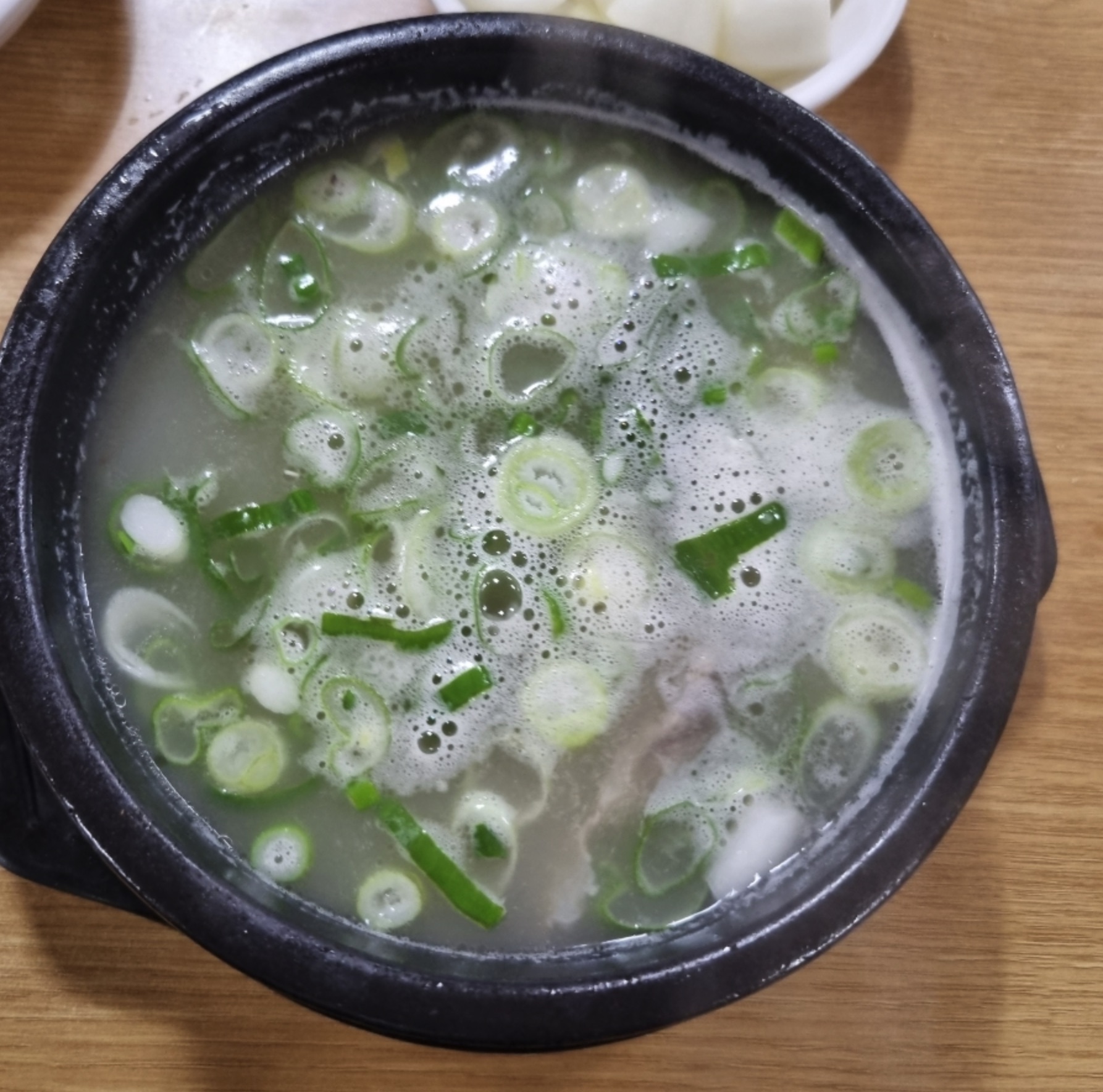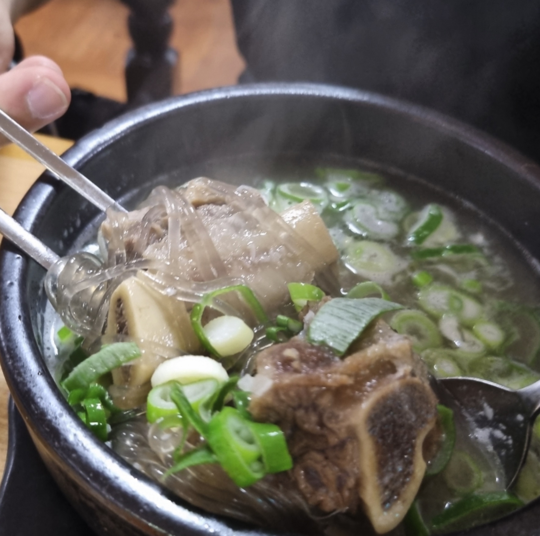 맑으면서도 뽀얀 국물에 파가 듬뿍 올라가 있습니다. 맵지 않은 파가 잡내를 잡아주어 국물이 깔끔했습니다. 안에는 부드러운 갈빗대와 살코기, 당면, 버섯이 들어있고, 대추와 황기 같은 건강한 약재도 눈에 띄었습니다.